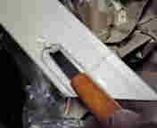 | 45°に正確に切断 | 彫刻刀でL字金具の部分を彫り込む | 取り付け |