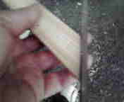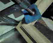 | 5mm厚の板を表側に取り付ける | ネジを隠すように加工材を木工ボンドで貼る。ヴァイオリンに使ったクランプがまた活躍。 | ![]() |