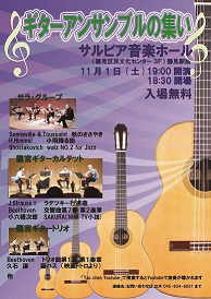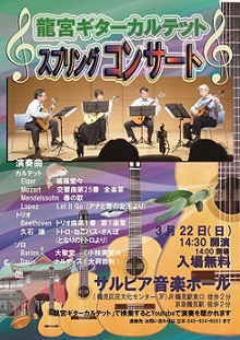 龍宮ギターカルテット スプリングコンサート 2015年3月22日(日)14:30開演 サルビア音楽ホール 入場無料 龍宮ギターカルテット ・Elger 威風堂々 ・Mendelssohn 春の歌 ・Rossini セビリアの理髪師 ・Mozart 交響曲25番 第1楽章 第2楽章 第3楽章 第4楽章 龍宮ギタートリオ ・Beethoven 弦楽三重奏曲 NO.1 ・久石 譲 となりのトトロより さんぽ・ねこバス・トトロ Solo ・Barios 大聖堂 ・Davis ナルディス ・アナと雪の女王 Let it go〜ありのままで |