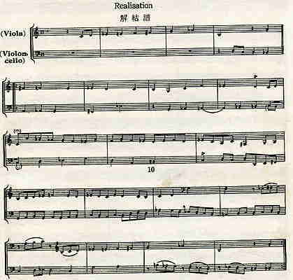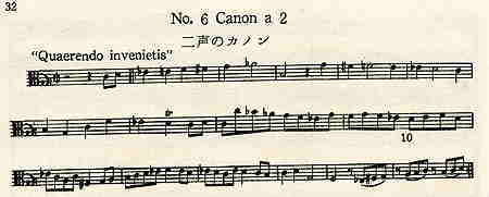 これは、ビオラとチェロの2重奏。ビオラは普通に弾く。チェロはビオラと向かい合って譜面を見る。しかも3小節遅れて、右から左に「受け流す!」ように弾いていくのだが、ビオラが 「ド レ ミ♭」と上昇で始まるところを、チェロは「レ ド シ」と下降して追いかける