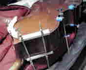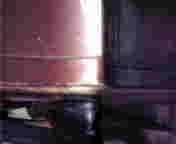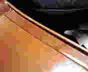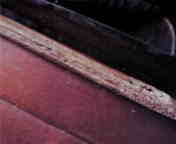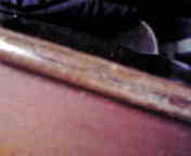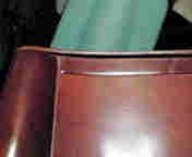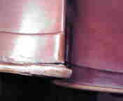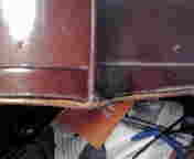 残念! 治したつもりが、他にも新たに 発見!表板にわずかなひび割 れがある。、合板を合わせた接 着が剥がれている。しかも虫喰 いがあるのだ!すべて合板、相 当の安物だ。だから倉庫に放っ て置かれたのだろう。一気にテ ンションが下がった。 |
