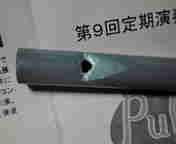 ![]() 試作品(水を入れて吹く) 瓶の方が水の量が見えて良い ピロピロピロと可愛い音がする ![]() φ18mmの塩ビ管、12cm 切り込みを入れる 内径φ12.8mmに合わせて木を削る ![]() 中に差し込み音が出る位置を捜す |