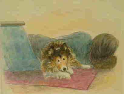 | せめぎ合い 室内犬になったチャッピーには、犬用ベッドとフカフカの布団が与えられたのに、なぜだか夫の席をねらっていた。ちょっとトイレにでも立とうものなら素早く移動して、座布団の上で丸くなる。しかられてもなかなか戻ろうとせず、時々様子を伺いながら寝たふりをしている。結局、無理矢理どかされるのだが…。その時の、ひんねり恨みがましい態度が後を引くのだ。犬相手に「本当に嫌な犬だなあ。」と夫が言った。チャッピーのほうもきっと「このクソ親父。」などと言っていたに違いない。 |
