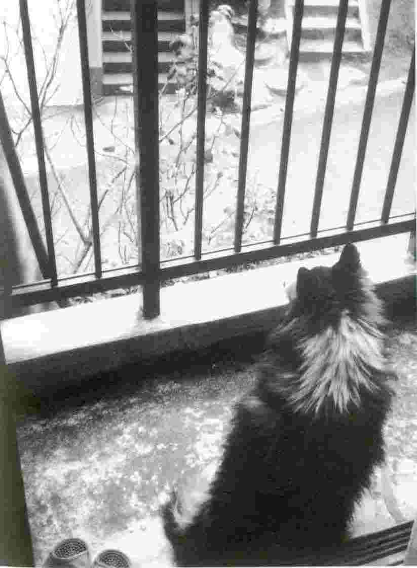 | 遅かったじゃない! 長ーい”自分の時間” 不用心は承知で2階のベランダを開けっ放しにしていた。一日中室内で留守番をしているチャッピーが、外を見たり日向ぼっこできるように…。夕方、家の近くまで帰ってきた私たちを見つけると大急ぎで階段を駆け降り、ドアの向こうで激しく吠えた。「ただいま!」と中に入っても歯をむき出して怒っている。”ヒャウヒャウ”、後退りしてなでさせない。「遅かったじゃない、遅かったじゃない、何してたの〜?」としばらく大興奮が続き、水を飲んでようやく落ち着く、これが毎日。日がな一日ひたすら道の彼方に飼い主の姿を捜し求めているのかと思うと不憫だった。思えば家に来てからずーっと留守番の日々、これからだって…。そんなとき「大丈夫よ!あの子は自分の時間を楽しんでるわ。」とご近所のAさん。「私たちの知らない”自分の時間”があったんだねぇ、チャッピー!」と少し安心。した 甘え上手は慰め上手 散歩の途中、Sさんに会うと足(靴)の上にグルッと、とぐろを巻くように座った。チャッピー流の甘え方で、「好きだよ…。」と素知らぬ顔で伝えているのだ。相手が子どもでも同じ、好きな子に近づいてなでてもらうのが上手だった。以前、病気をしたときは、ずいぶんチャッピーに助けられた。寝転んでいると、気配もなくやって来ては、脇腹のあたりにくっついて丸くなった。上目づかいでそれとなく様子を伺っているのだ。気弱になった私を一生懸命に慰めていたつもりかもしれない。「ありがとう、甘ったれのチャッピー!」 次のページへ |