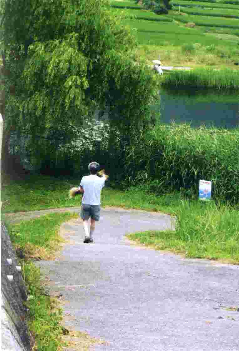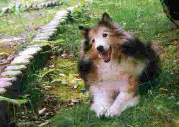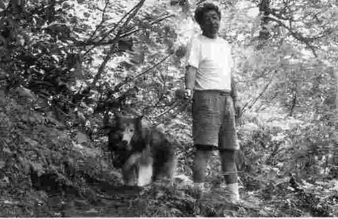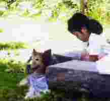 | もうひとつの出会い この年はもう一つの出会いがあった。ずっと前からお世話になっている鎌池ブナ林亭のYさんのお孫さんたちだ。東京に住んでいて、毎年夏休みのほとんどを小谷で過ごすという、かわいい小学生の姉妹。二人はチャッピーに話しかけたり、似顔絵に描いたり、花で作った飾りを耳につけたりして遊んでいた。以前ならじっとしていなかっただろうに、この頃のチャッピーはすっかり子ども好きになっていたから、何をされても嬉しそうだった。目も耳も鼻も衰えて、ずいぶん動きが鈍くなっても、翌年も、翌々年も歓迎してくれた。本当に幸せ者だ。昨夏も小谷で彼女たちに会ったが、チャッピーをなくした私たちがよほど寂しそうに見えたのか、交わす言葉も少なく、なんとなく遠慮がちだった。 |