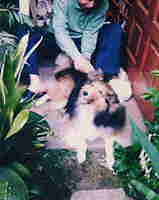 | 何食べてるの〜? 家の周りの約半周はチャッピーが自由にしていた。台所の床に前足をかけて「ごはんまだ?」、今度はぬれ縁から居間をのぞいて「あ〜お菓子食べてる…。」出掛けに玄関に置いた林檎の包みを鼻でほどいていたこともあった。夕方、帰宅して炊事の前にちょっと腹ごしらえと思ったら何やら視線を感じる。ドアのわずかな隙間に鼻面があった。「わ〜、見てたのね。」驚くほどの執着心。当時は「この食いしん坊!」などと思っていたが、”食べることに一生懸命”は人間も含めて、生きて行く者にとって最も必要なことだと思う。どんな時もおろそかにしてはいけないことなのだ。後に、この驚くべき”食い意地”がチャッピーを大病から救うことになるのだから。 サマーカット 暑いからといって毛を刈っていいものか迷っていた。(賛否両論あるらしい)体格がよくなるにつれて三毛がたっぷりなびいて美しかったから、よけいに切ることがはばかられた。けれども暑さに喘いでいる様子を見ると気の毒で、見てくれはどうでもいいからさっぱりとさせてやりたくなった。蒸し暑い6月に一回目、7月、8月はさらに短く切る。犬は人目など気にしないからいいようなものの、いやに足長になった後姿なんかちょっと情けなかった。残暑が厳しくても9月には切らない。秋風が吹き初める頃には少しずつ毛皮のコートを厚くしていかなければならないから…。 |