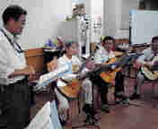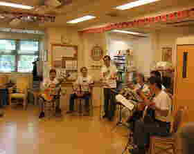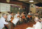 | ●慰問演奏 やしの木クリニックDS 2010年7月16日(金) ラクンパルシータ、アロハオエ、瀬戸の花嫁、悲しい酒、禁じられた遊び、夏の想い出、アルプス1万尺、雪山賛歌、箱根八里、知床旅情 左から2番目が管理人 |