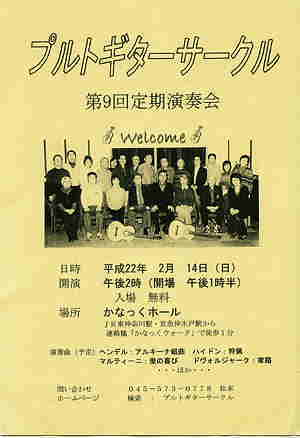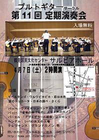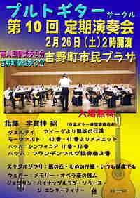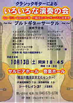 | ●プルトギター 第11回定期演奏会 2011年4月7日(土) 鶴見区民文化センター サルビアホール ・Purcell 「アブデラザール組曲」よりRondo ・Handel シバの女王の入場 ・J.S.Bach 「音楽の捧げもの」より4声のカノン ・J.S.Bach Vn Concert NO.1 ・Kleynjans Grand Canon Op.91 ・Praetorius Ballet du roy ・Piazzolla Libertango ・Anon ワルツ ピカ ピカ ・Popp 恋は水色 ・Rolland 涙のトッカータ ・日本の調べ、さくら、 |