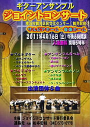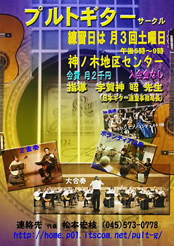 | ★ギターアンサンブル ジョイントコンサート 2011年4月16日(土)PM18:00(開場17:30) サルビアホール(鶴見駅前)入場無料 出演団体&曲 ●プルトギター スワンダフル、リチェルカーレ、バロック風春がきた、他(管理人出演) ●コモドギター モルダウ、少年時代、ラヴァースコンチェルト、他 ●アンサンブル・カノン 小さな旅、地上の星、ラ・クンパルシータ、他 主催 ジョイントコンサート実行委員会 |
