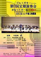 | プルトギター第13回定期演奏会2014年5月3日(土)14:00開演 かなっくホール(JR東神奈川駅前) T部 バッハ:管弦楽組曲2番(ロンド・サラバンド・ブーレ・ポロネーズ ・メヌエット・パディネリ) スペイン舞曲1番(ファリャ:はかなき人生より) コルドバ夜想曲(アルベニス:スペインの歌より) U部 映画音楽から ロミオとジュリエット , ハッピートーク(南太平洋) さよならの夏(コクリコ坂から) 三つのメキシコ民謡 シェリトリンド エストレリータ ラ・ゴロンドリーナ 他 |