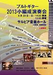 | ●プルトギター小編成演奏会 2013年9月29日(日)14:00 JR鶴見駅東口・京急鶴見駅前 徒歩1分 サルビ音楽アホール ・5重奏 海辺の少女・アムール河の波・コーヒールンバ ・2重奏 明るい表通りで・黒いオルフェ・夜は千の眼を持つ ・独奏 アルハンブラ宮殿の想い出 ・4重奏 カルメン組曲より ハバネラ・闘牛士の歌 ・7重奏 タンゴ・グラナダ・エスパニアカーニ ・4重奏 胡桃割り人形組曲 全曲 (これに出演予定) |