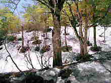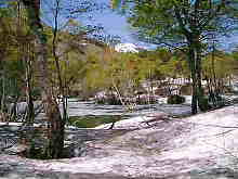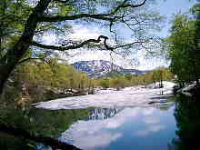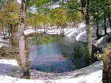 | 雪解けの鎌池はまだ危険と隣り合わせである。雪の斜面からの滑落もさることながら、「ズボッ」と足を取られたり、「ビシッ」と音をたてて雪の下から木が跳ね上がる。しかし白い雪と新緑の若葉が好対照で魅力的だ。 |